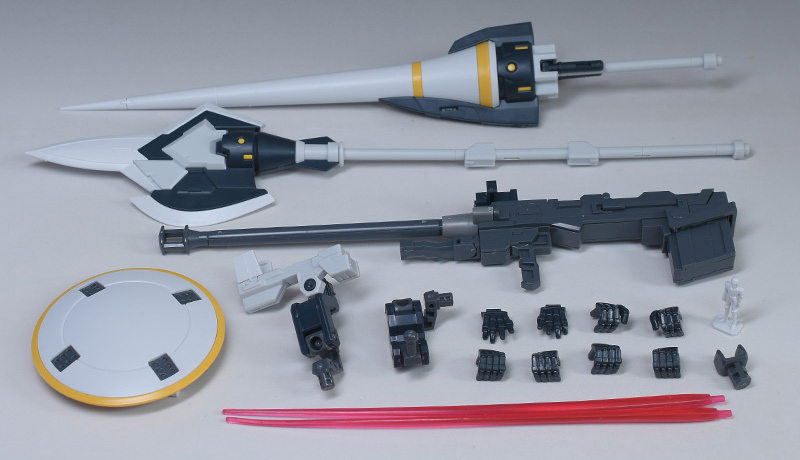 ヒートランス(テンペスト装備)、ヒートハルバード、ドーバーガン、シールド、ジョイントアーム2種、指パーツ各種(平手用:左右、武器保持用:左右、握り手用2種:左右)、ビームサーベル刃✕2、ディスプレイ用ジョイントパーツ、ゼクス・マーキスフィギュアが付属。