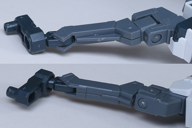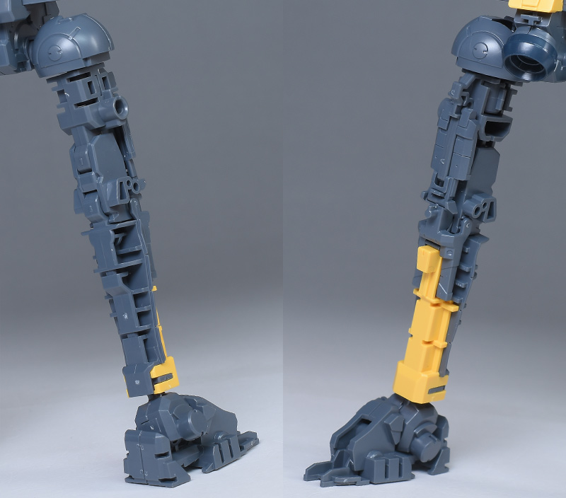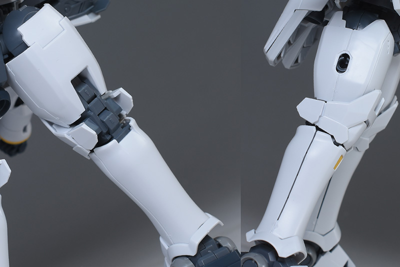 大腿部、膝から下ともにフレームに前後から白い外装を被せる仕様。大腿部側面の合わせ目は段落ち、膝から下はグレーのラインでモールド化されています。