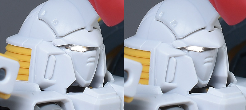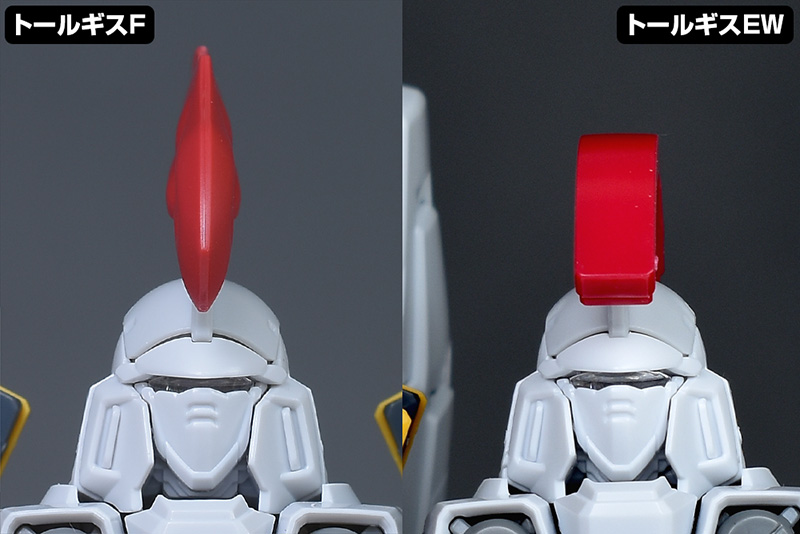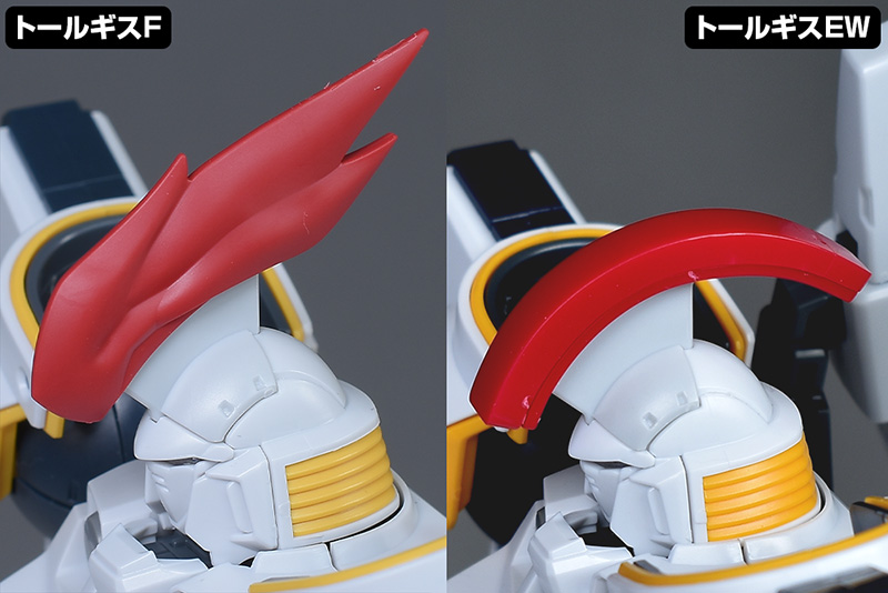 頭部をトールギスEWと並べて比較。大部分の形状は同じですが、頭頂部のクレストはトールギスF用に赤い鳥羽状の装飾が新造。より風格が感じられるデザインになっています。ツインアイ型のバイザーはクリアパーツでの再現でクリアブルーに塗り分けが必要です。