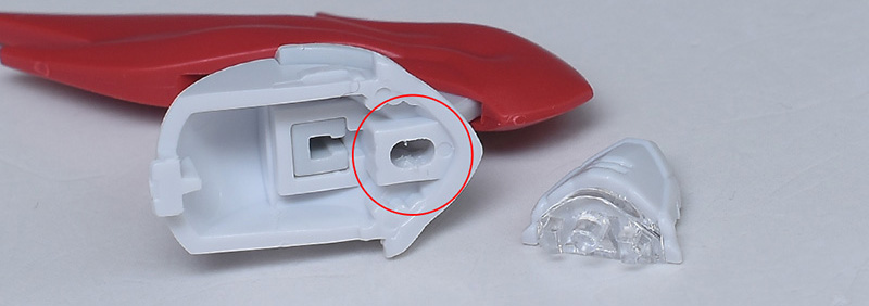 マスクパーツは位置(赤◯)を組み替えることで、表情を少し前後に変化させることができます。後方に配置する場合はリーオーセンサーのクリアパーツを外します。このあたりの仕様も通常のトールギスEWと同じ。