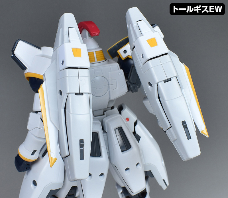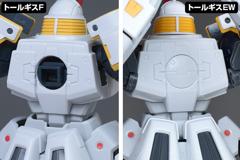 背部をトールギスEWと並べて比較。中央の丸型カバーがオミットされ、背部ウイングバインダーとの接続部が露出した状態になっています。左右脇のスーパーバーニア用アームもありません。