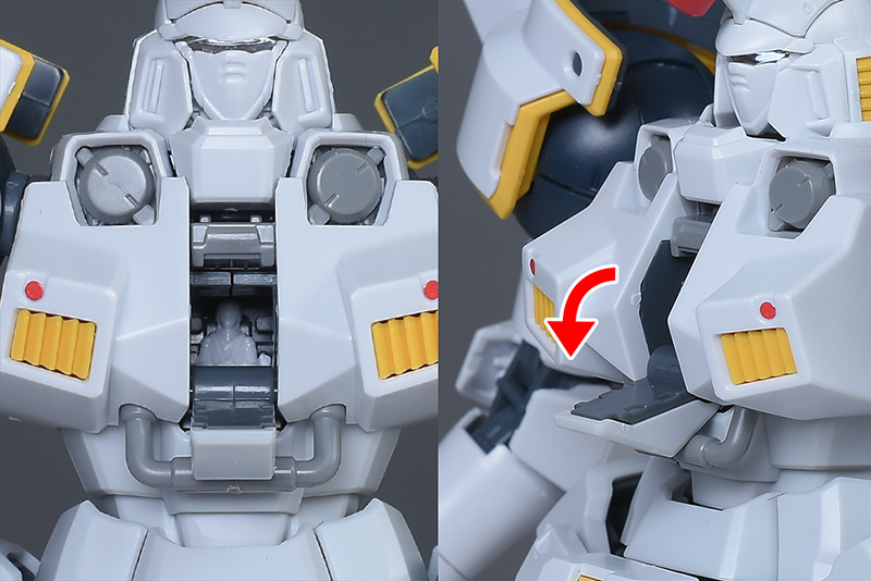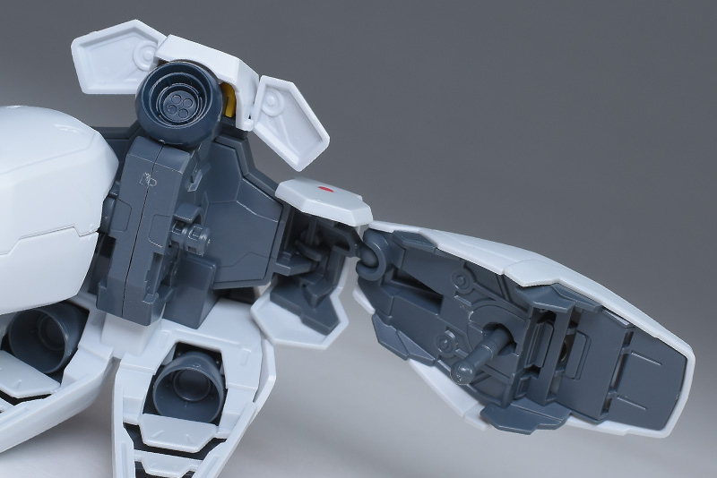 ショルダーアーマーも合わせ目ができないパーツ構成。装甲内側の3色ラインなど、内外各部がパーツで細かく色分けされていて完成度が高いです。側面の懸架モジュールはハッチが開閉可能。付属のジョイントアームを用いてシールドやドーバーガンを装備することができます。