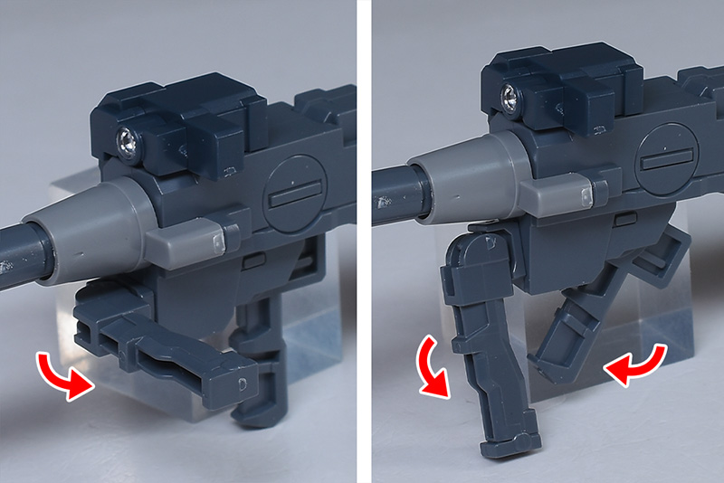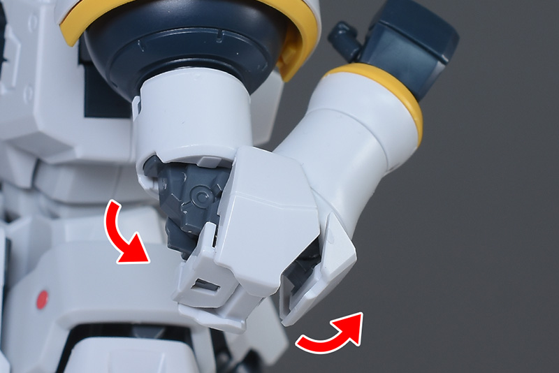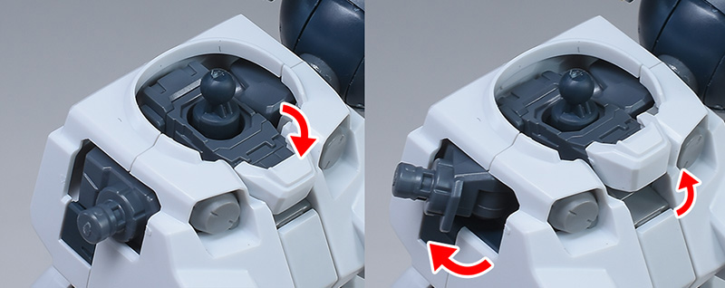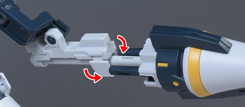 ドーバーガンも付属のジョイントアームを肩部に組み付け、アームのボールジョイント部分を赤◯に接続します。ボールジョイント接続部はフレキシブルに可動。
