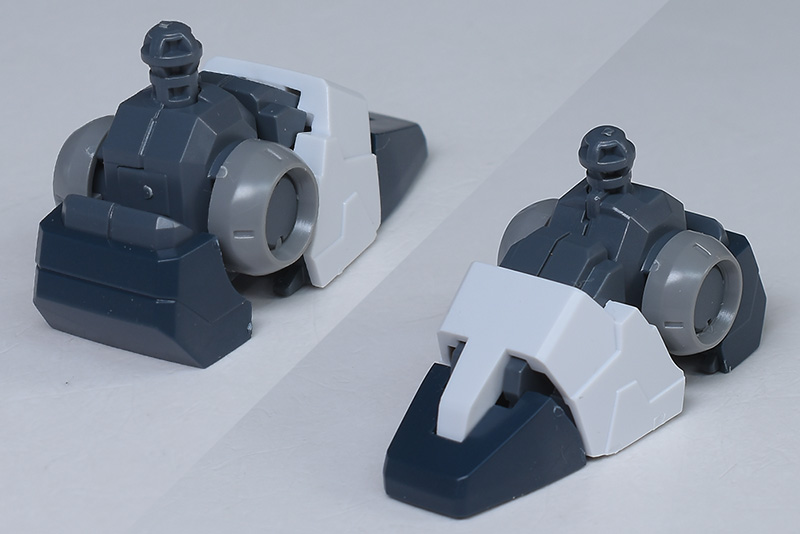 脚部。こちらもトールギスと同形状で特有の筒型装甲が造形されています。モールドも少なく、シンプルでスタイリッシュなデザインになっています。スネのモールドは黄色いパーツでの色分け。足首をひねると裾のパーツが干渉して外れやすいので注意です。
