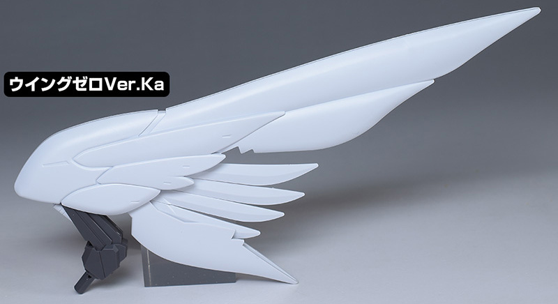 主翼をMGウイングガンダムゼロVer.Kaのものと比較して。シルエットは同じですが、一部装甲がトールギスF用に新造。表面はイエローパーツで再現されたゼクス・マーキスパーソナルマークが存在感を醸し出しています。更に一部装甲にはエッジが効かせてあり、小羽もなども付け根にモールドが入ったものが新造。
