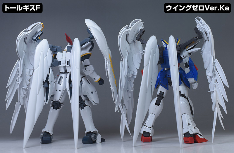 ウイングバインダーの流用元であるMGウイングガンダムゼロEW Ver.Kaと並べて。本体がトールギスとガンダムで違っていますが、並べると兄弟機のような雰囲気があります。何気にトールギスFのほうが系譜が前ですが、それを感じさせないくらいの気品が・・・;
