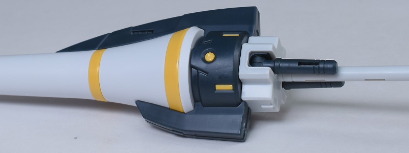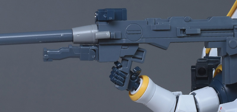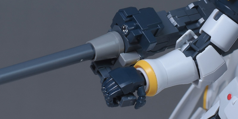 ドーバーガン。右肩に装備するカートリッジ式のビーム砲です。一撃で複数のMSを破壊する性能を持ちながら、発砲時の反動も大きいとのこと。反動を抑えるため、砲口にはマズルブレーキ(開口)が再現されています。MGトールギスEWに付属しているものと同じ。