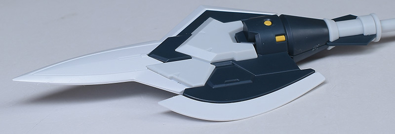 先端のやり部分は多数パーツの組み合わせでしっかりと作り込まれています。イエローの細かなモールドさえもパーツできっちりと色分けされていて完成度が高いです。刃の部分もパーツ分割されているため、塗り分けがラク。