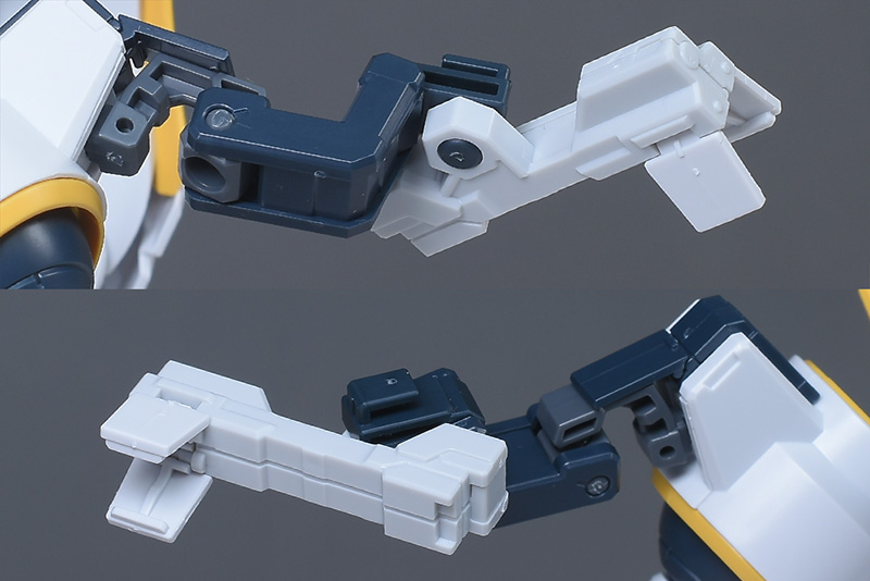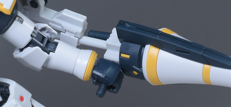 腕部もトールギスEWと同じです。肩、上腕、前腕各部にトールギス特有の筒型装甲が造形。肩と前腕のふちはイエローのフレームパーツでおしゃれに色分けされています。