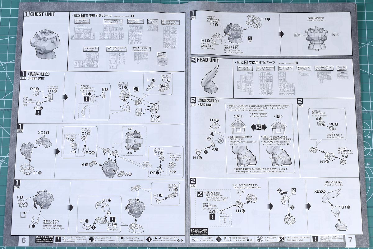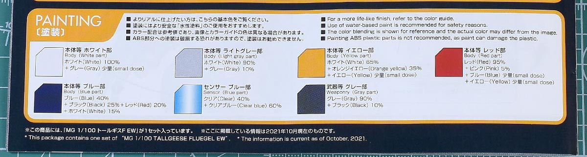 カラーガイド。色種はまずまず、調色もまずまず・・・?といった感じ。各部がパーツで細かく色分けされていますし、合わせ目もドーバーガンくらい?なので塗装はしやすいと思います。ウイングバインダーや外装各部に丸モールドがあるので、その当たりの塗り分けが必要ですが、ハセガワのつや消し黒フィニッシュシートをポンチでくり抜いて貼り付けるのも手かと。