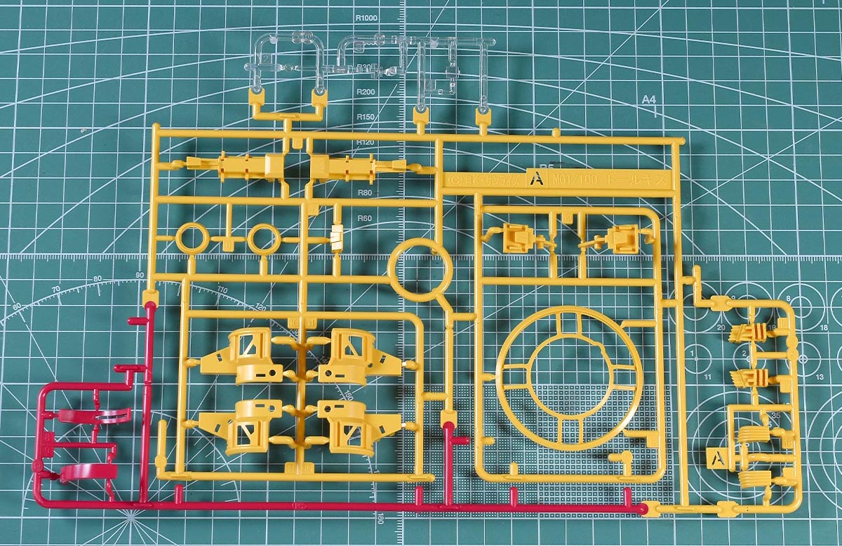 ↑Aランナー。イエロー、レッド、クリアーのイロプラランナーで、頭部センサーや各部ダクト、肩部、スネ部、手首の色分けラインパーツなど。MGトールギスEWからの流用ランナーです。