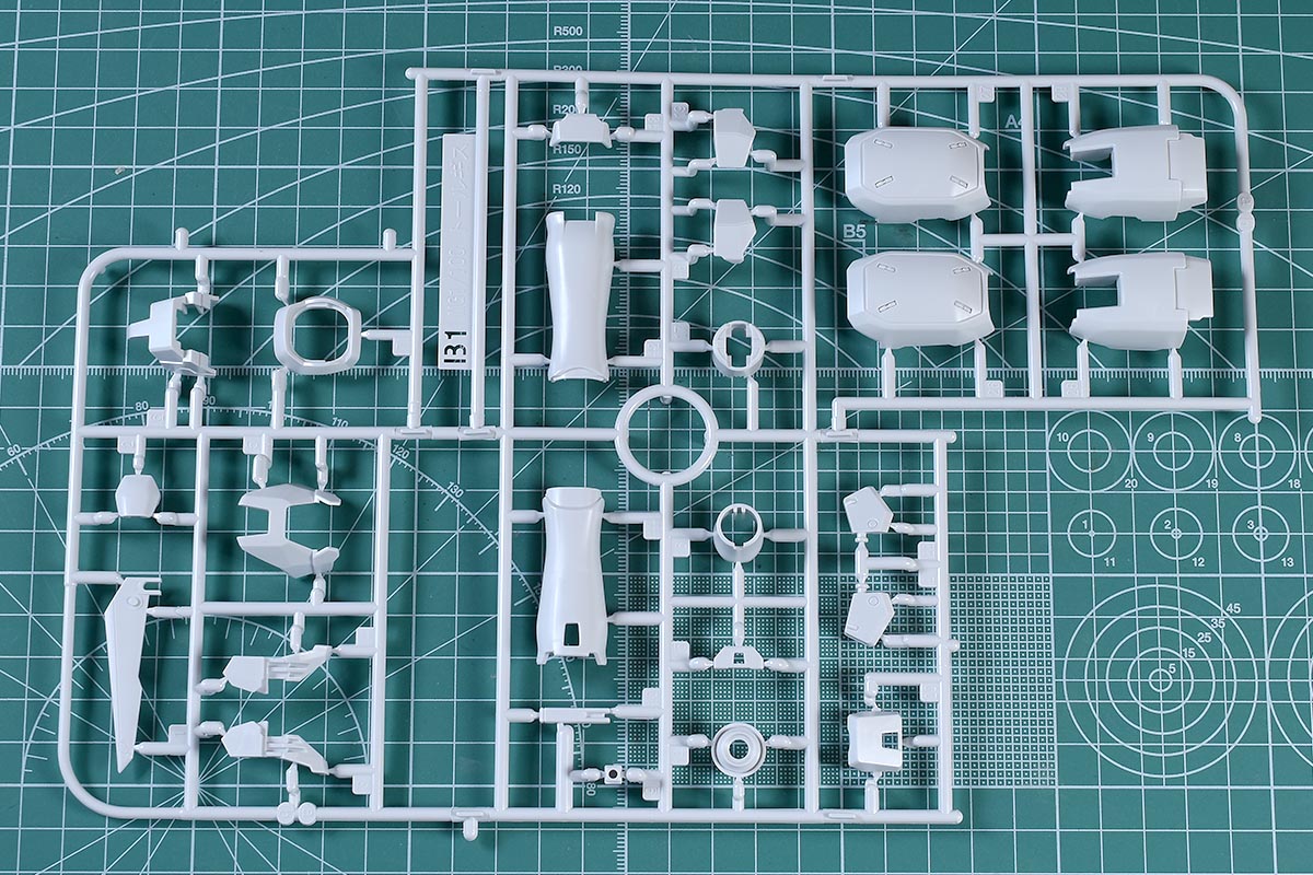 ↑B1、B2ランナー。ホワイト成型色で、腰部や四肢の外装パーツ類です。MGトールギスEWからの流用ランナー。