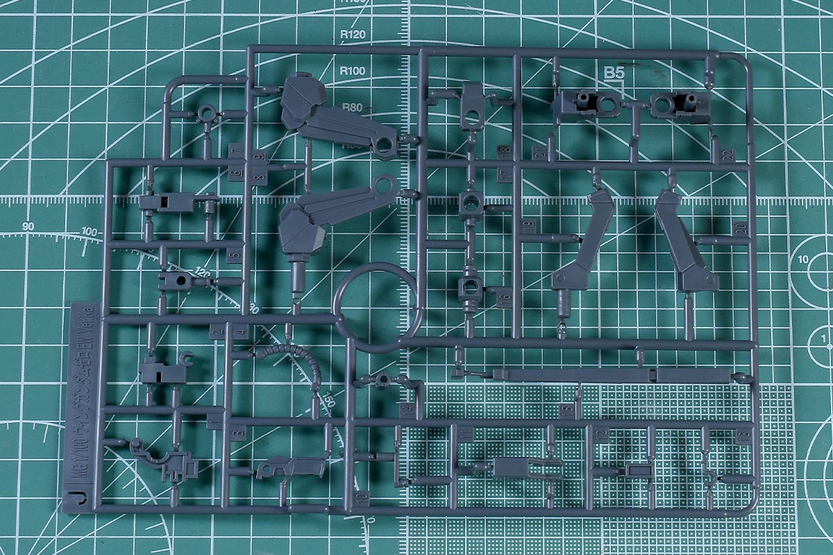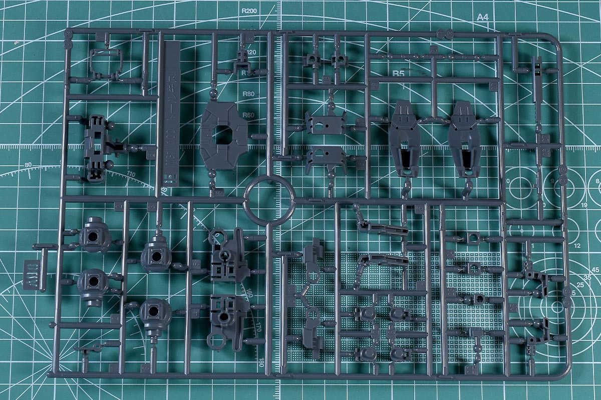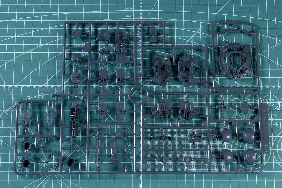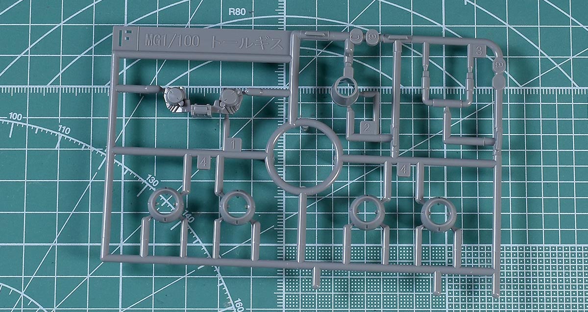 ↑Eランナー。グレー成型色で、胴体部や脚部など、強度が必要な箇所の各部パーツ類。ABS素材です。MGトールギスEWからの流用ランナー。