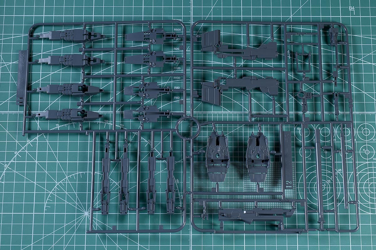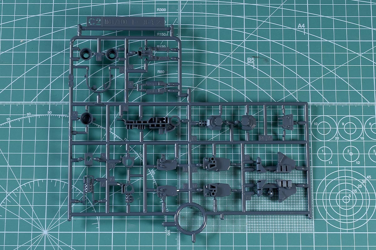 ↑C1、C2ランナー。グレー成型色で、胴体部や四肢などの各部内部パーツ類とシールド用パーツです。MGトールギスEWからの流用ランナー。