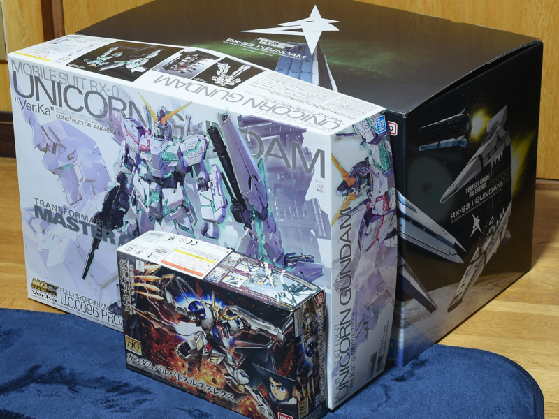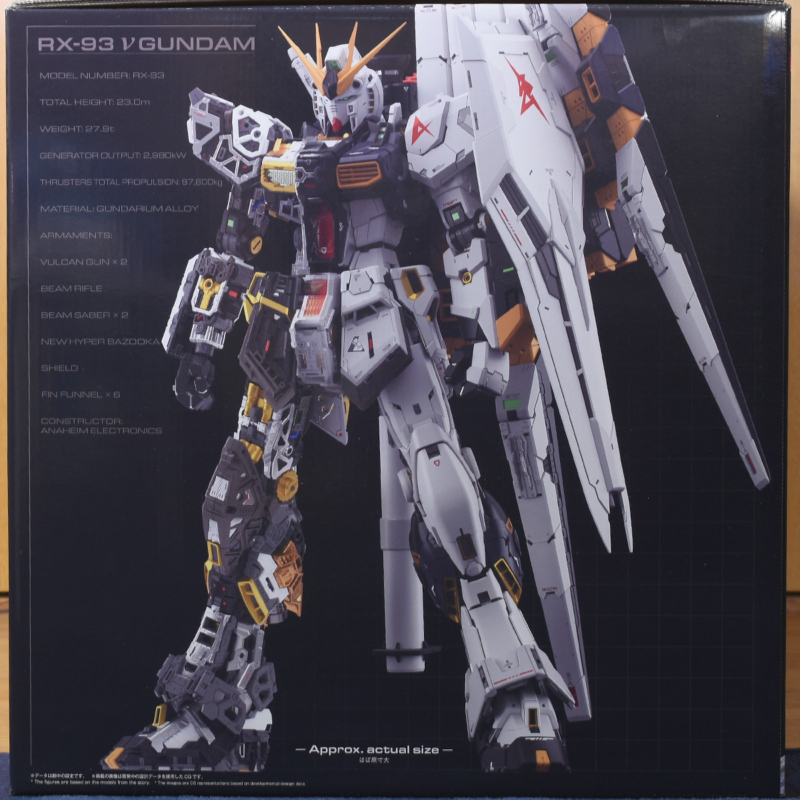 まずはパッケージから。とにかく巨大で、撮影ブースには全く収まらないレベル。サイズ感で言うとMGEXユニコーンガンダムの2.5個分くらいです。MGEXユニコーンはHGUCナイチンゲールやHGCEデストロイガンダムなどと同じ大きさ。これらも結構デカいですが、それの倍以上とは恐れ入ります;;調べたらHGUC ネオ・ジオングよりは小さいようでした;ちなみに一般的なHGのパッケージだと20個分くらいでした;