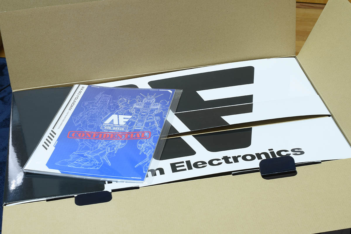 蓋を開けるとこんな感じ。説明書が上にドーンと置いてあり、中には小型の個別パッケージが3箱入っています。パッケージ3個を組み合わせることで「AE」が形成されている辺り、ここから既にコンセプトである「MSの建造体験」が始まっている感じですね。