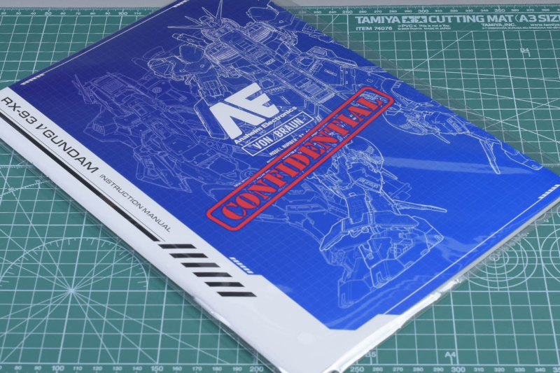 続いて説明書です。表紙はAEの機密資料扱いで、これもMSの建造意欲を高めてくれるような仕様になっています。全部で105ページほど。分厚いです;
