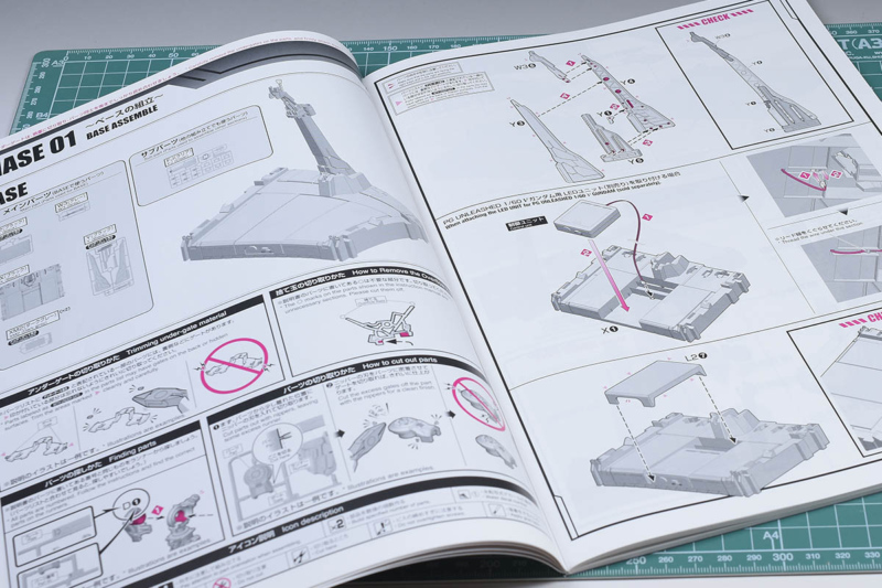 簡単に説明書でした。流れとしては、台座→フレーム→外装→武装類→外装各部の展開方法→フィン・ファンネルの順に記載されています。パーツは外装がアンダーゲート仕様。LEDユニットの組み込み方法も記載されています。