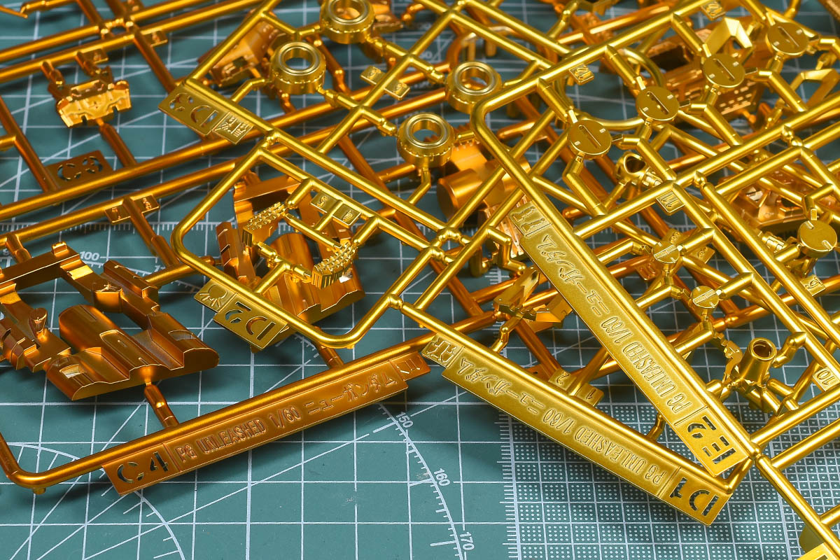 ゴールドのメタリック成形色パーツは赤みの強いものと黄色味の強いものの2色。MGEXストフリなどで見られた仕様です。