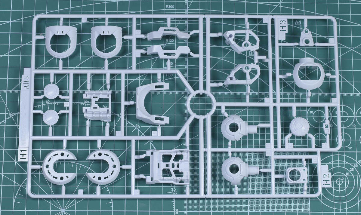 ↑Hランナー。ABS素材です。同じものが2枚あります。ホワイト成型色のランナーでも、強度が必要な箇所のパーツはABSとなっています。