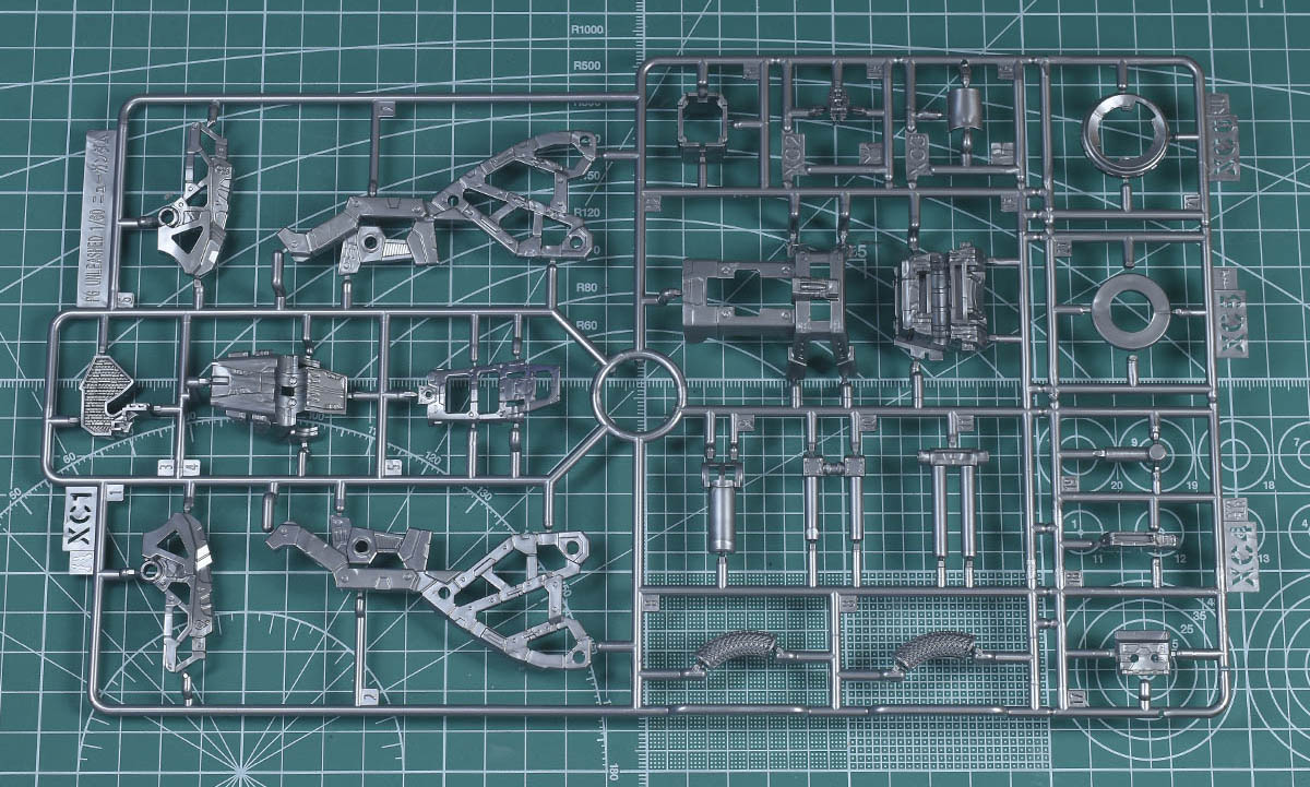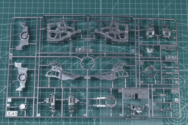 続いて内部フレームのランナーになります。ランナーはXA~XQまで。こちらはシルバーが程よく混ざりますが、その他はダークグレー成形色パーツが多いです。強度が必要なため、多くのランナーはABS素材となっています。一通りそうぞ。