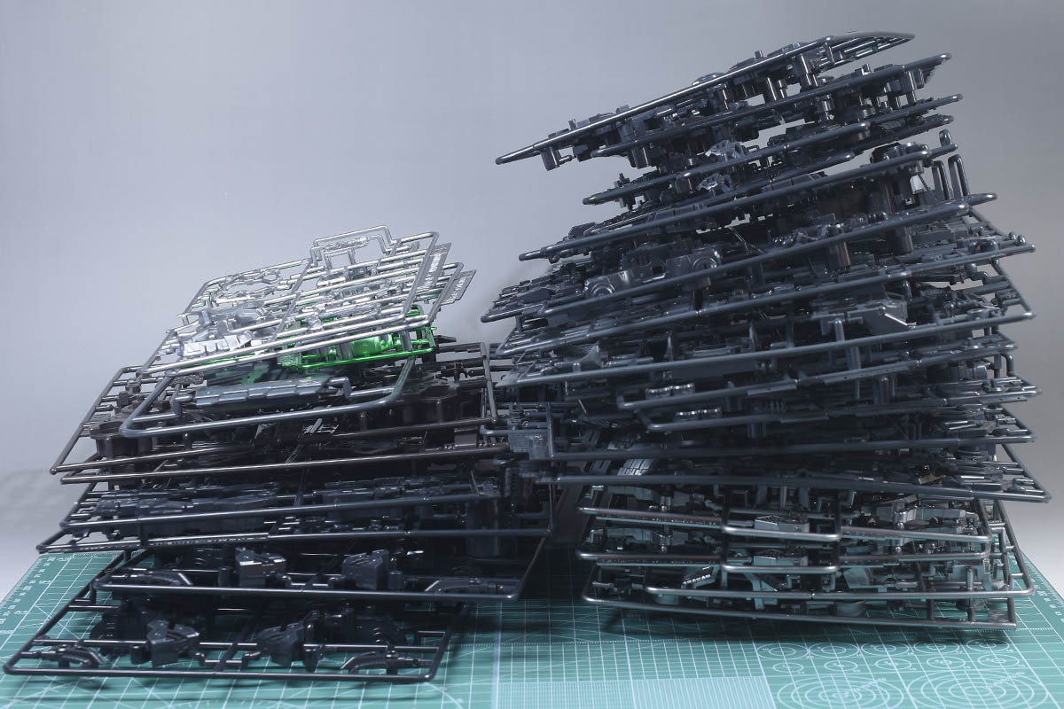 外装、武装類、台座のランナーを積むとこれくらいに。メタリック成形色のランナーは重ねると傷が付く場合があるので積まないようにご注意ください。(積んでるけど;)
