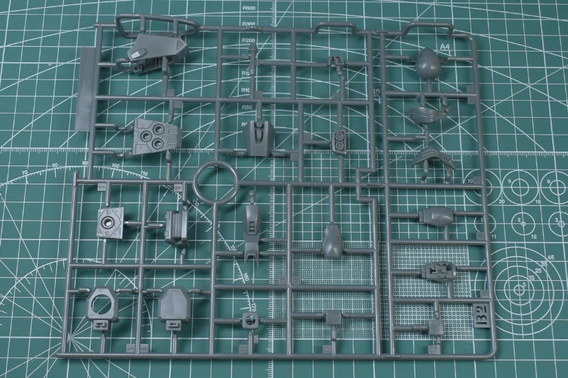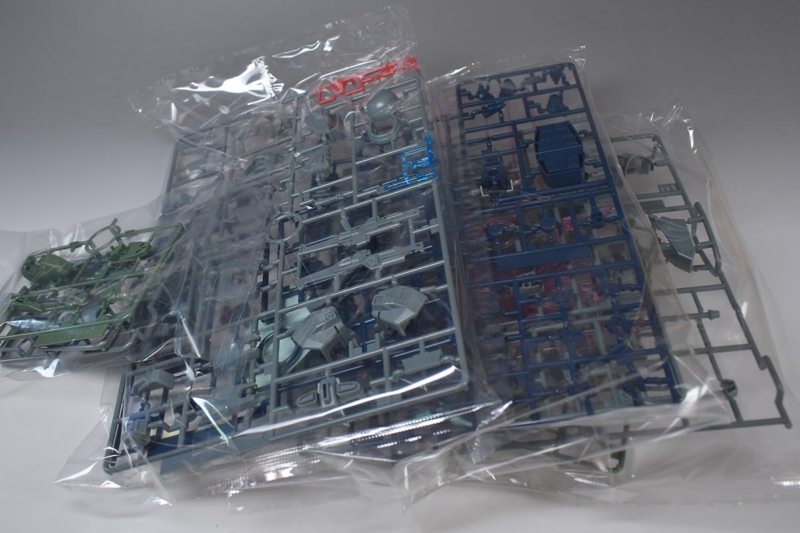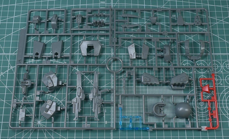 ↑Aランナー。グレー、レッド、クリアブルーのイロプラランナーで、頭部や胴体部、肩部、バックパックパーツ、ビームライフル、ビームシールドパーツなど。