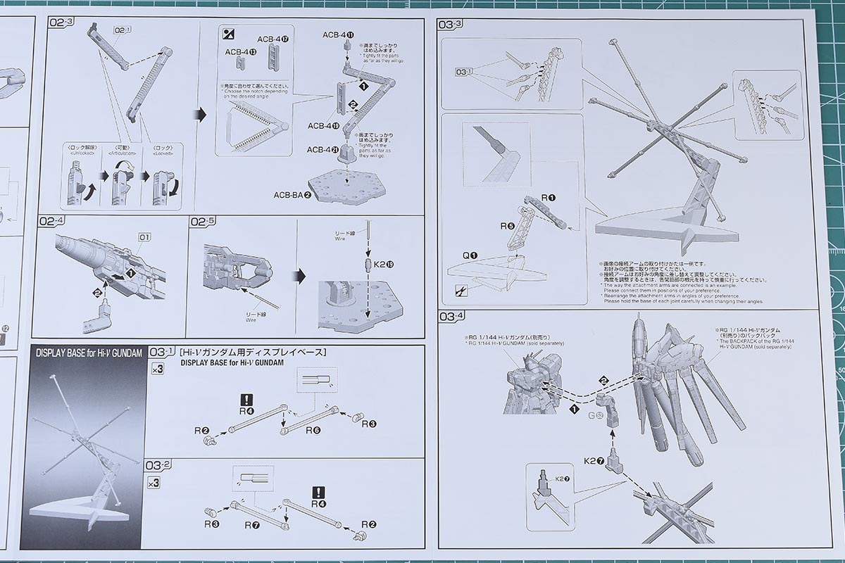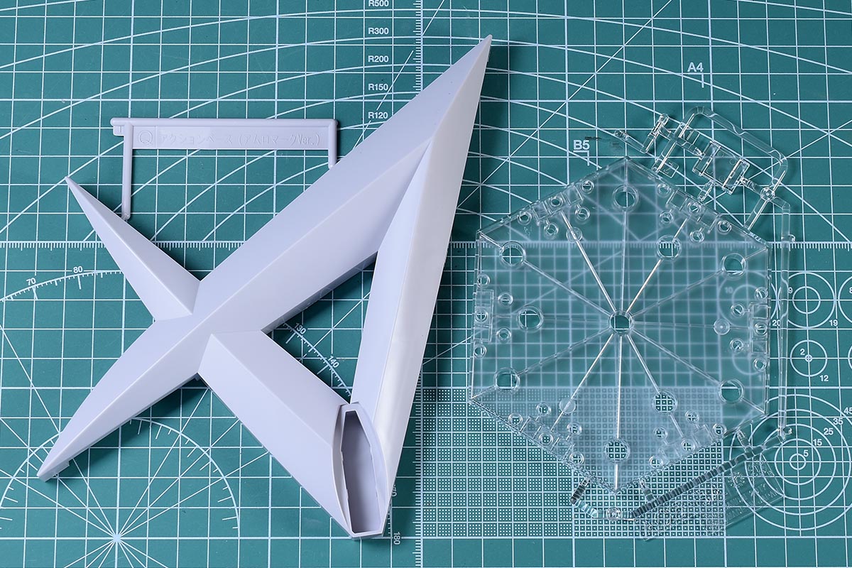 説明書は大判B5サイズ。プレバン商品いつもの白黒簡易版説明書です。こういったサポート武器、ディスプレイアイテムはアクションベース用のパーツが付属するので、一般発売のアクションベースを買わなくて済むのがメリット。たまに破損したりするジョイントパーツも予備として確保できるのが嬉しいところです。