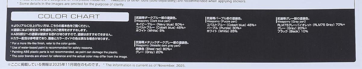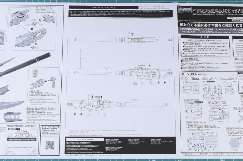 カラーガイド。RG Hi-νガンダムと並べるとわかりますが、ハイパー・メガ・バズーカ・ランチャーはRG Hi-νガンダムとは成形色が違っています。カラーチャートも同様。ですができれば色味を合わせる、もしくは少しだけ違って魅せるなどで専用兵器としての統一感を出してみても良さそうです。