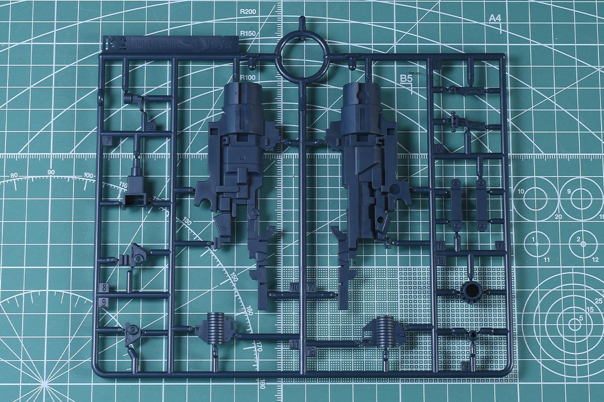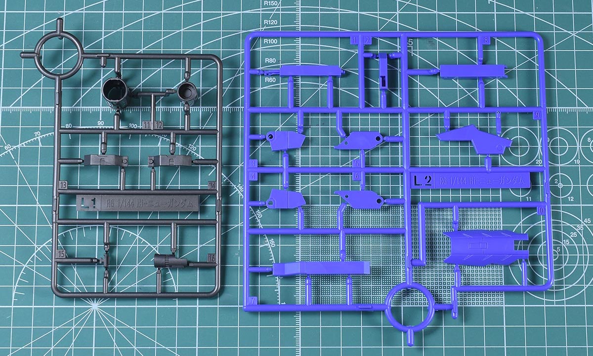 ↑L1、L2ランナー。L1はメタリックグレー成形色、L2は淡めのブルー成形色で、ハイパー・メガ・バズーカ・ランチャーの各部パーツ。どちらもKPS素材です。