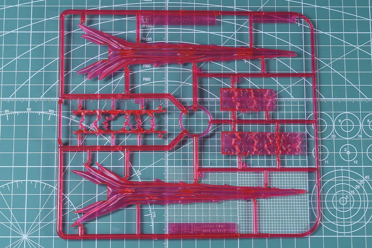 ↑Mランナー。クリアピンク成形色で、フィン・ファンネル用のエフェクトパーツ。同じものが2枚あります。RG Hi-ガンダム用フィン・ファンネルエフェクトからの流用です。