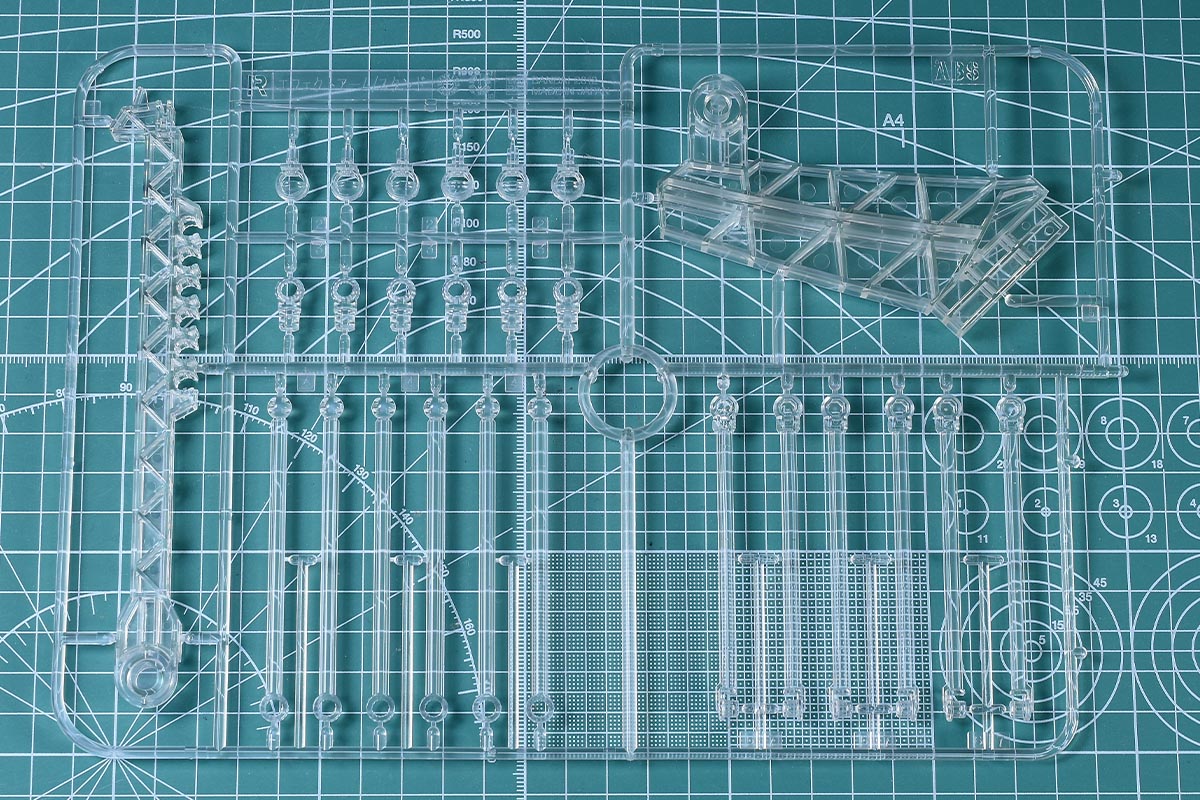 ↑Rランナー。クリア成形色で、ディスプレイベースの支柱やアームパーツ。ABS素材です。こちらもMG νガンダムVer.Kaなどからの流用ランナー。