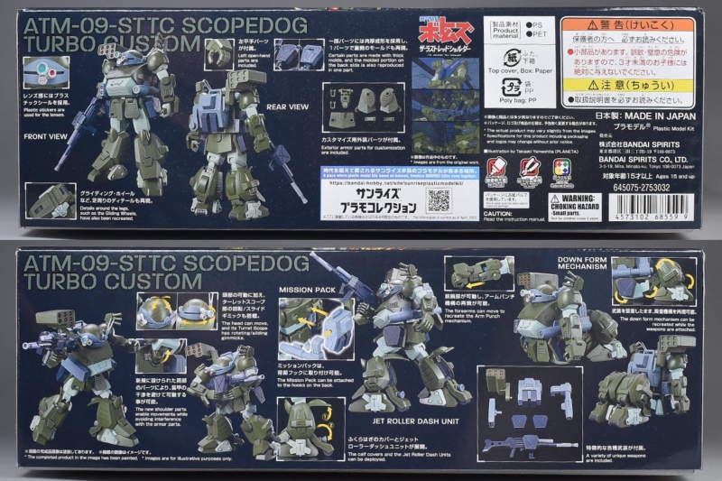 パケ絵はジェットローラーダッシュ・ユニットで滑走しつつ、ヘヴィマシンガンで射撃するスコープドッグターボカスタムの姿が掲載。激しい銃撃戦の中、ブースターから炎、ローラーから火花が飛び散るという臨場感あるイラストになっています。おそらく劇中、ペールゼンがいる基地通路内での戦闘をイメージしたものかなと。