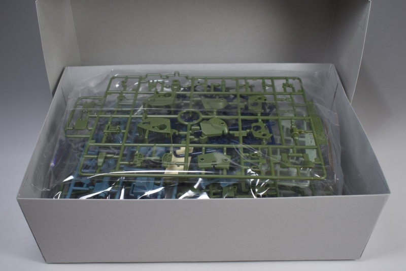 パッケージサイズは一般的なHGよりも高さが1.5~2cm程度大きめ。キット自体は特別大きくはないですが、スコープドッグ本体に加え、7連ミサイルポッドやガトリングガンなどの各種武装、カスタマイズ用パーツ、通常のスコープドッグの余剰パーっつが多数含まれるため、ボリュームが増しています。