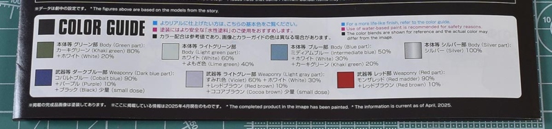 カラーガイド。HGスコープドッグやHGバーグラリードッグと全く同じです。成形色がかなり良いので、塗装して色を変えるのもなんかもったいない感じがしますし、ガンプラのようにマーキングデカールを貼るのもなんか違う気がします。うまく金属感を出しつつ、汚しを加えて仕上げるのが一番ベストな気もしますね。