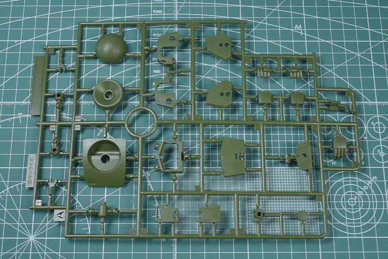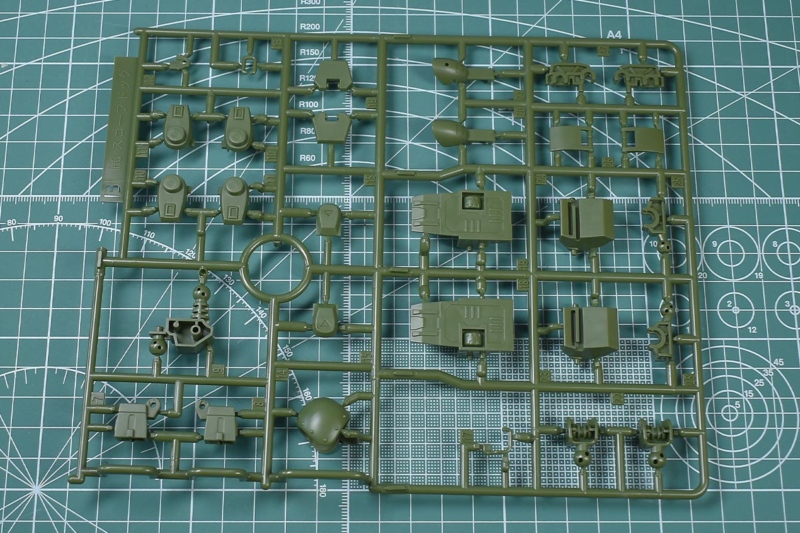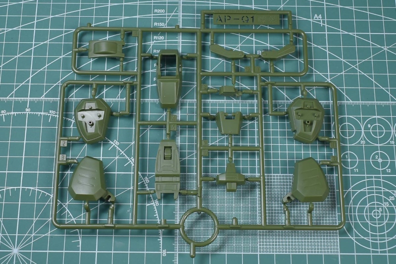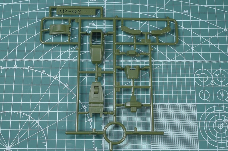 ↑AP-Q1、AP-Q2ランナー。グリーン成形色で、肩部スモークディスチャージャーや脚部ターボユニットパーツ。このターボカスタム用の新規ランナーです。KPS素材。