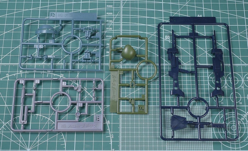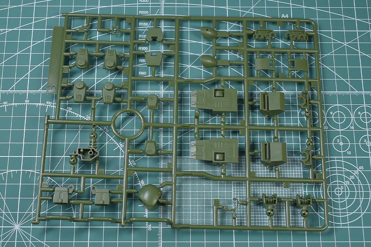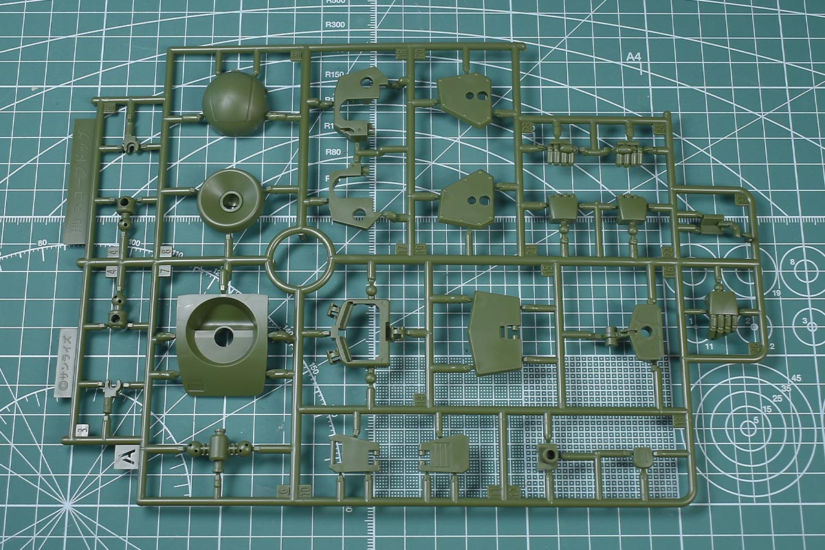 ↑Aランナー。グリーン成型色で、頭部や胴体部、ハンドパーツ、ディスプレイ用ジョイントパーツなど。KPS素材です。HGスコープドッグからの流用ですが、左側の胴体部パーツが省かれています。