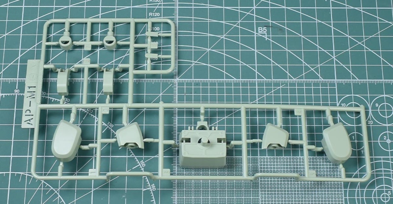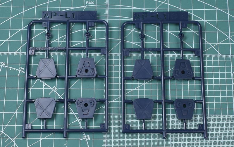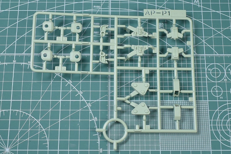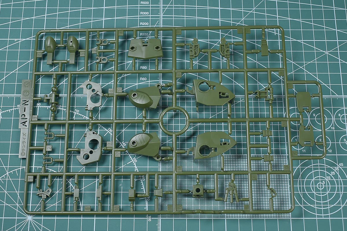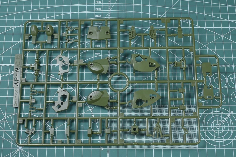 ↑AP-P1ランナー。ライトグリーン成形色で、肩部や脚部ターボユニットパーツなど。このターボカスタム用の新規ランナーです。KPS素材。