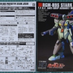 今回は、HGUC 1/144 RGM-89S プロト・スタークジェガンのパッケージ、ランナーをご紹介します!箱絵や説明書等も合わせてご紹介していきます。では箱絵からどうぞ。 パケ絵は手前にビーム・ライフルを装備した素立ち画像と、背景にはハイパー・バズーカで射撃する姿が掲載されています。背景はどのシーンかはわかりませんが…