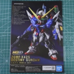 今回は、MGSD デスティニーガンダムのパッケージ、ランナーをご紹介します!箱絵や説明書、カラーガイド等も合わせてご紹介していきます。では箱絵からどうぞ。 パケ絵は光の翼を展開し、アロンダイトビームソードを両手で構えるデスティニーガンダムの姿が掲載。青い宙域にピンクのビームが映える、印象的なイラストになっています。この…