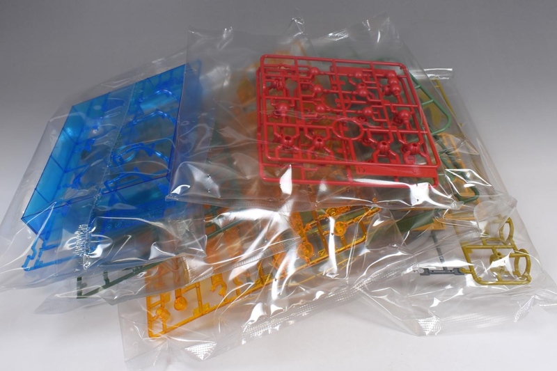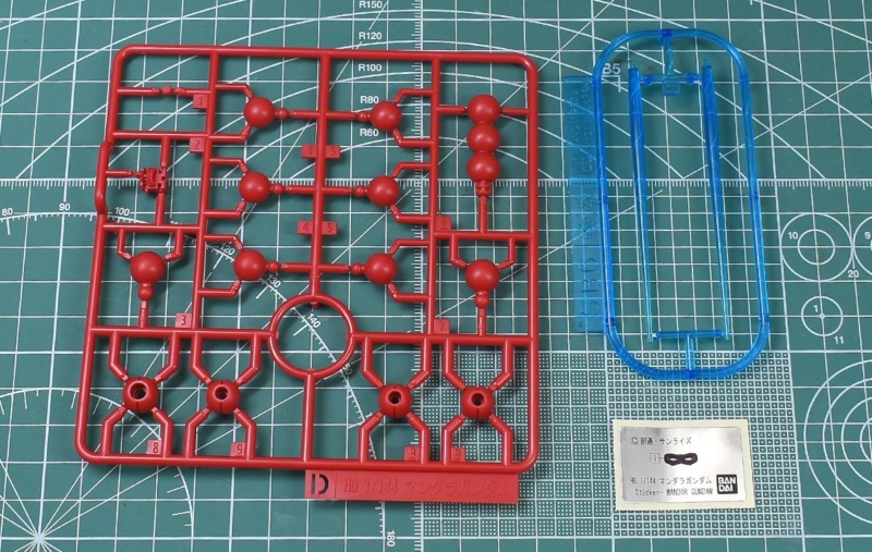 ↑D、SB6ランナー、ホイルシールです。Dはレッド成形色で、頭部や腕部、腹部パーツ。KPS素材で、同じものが2枚あります。SB6はクリアブルー成形色で、仕込み刀用エフェクトパーツ。