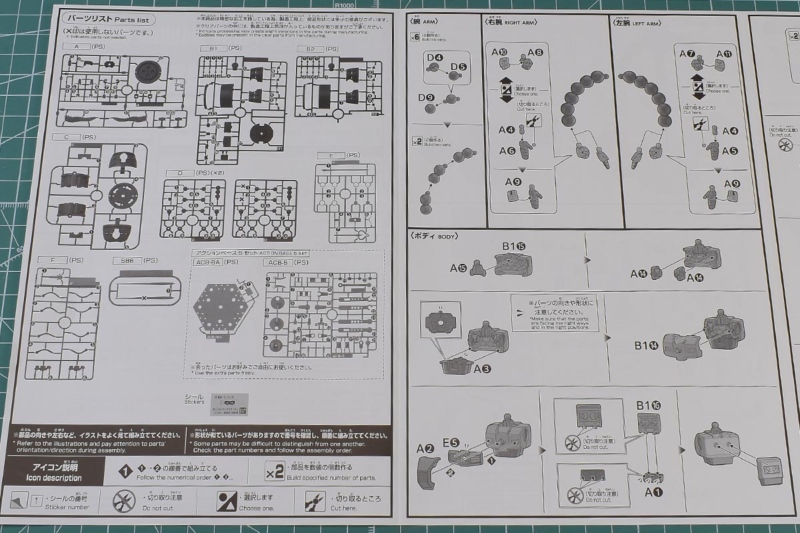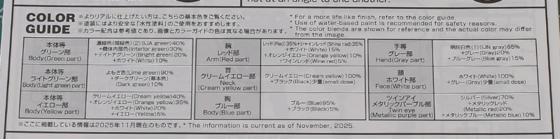 カラーガイド。全体的に色種が多く、調色もそこそこ複雑。なのでガイドの通りに塗装する場合は少し手間がかかりそうです。まぁ成形色がかなり良く、開発側のこだわりが感じられるので塗装しなくても十分ではありますね。